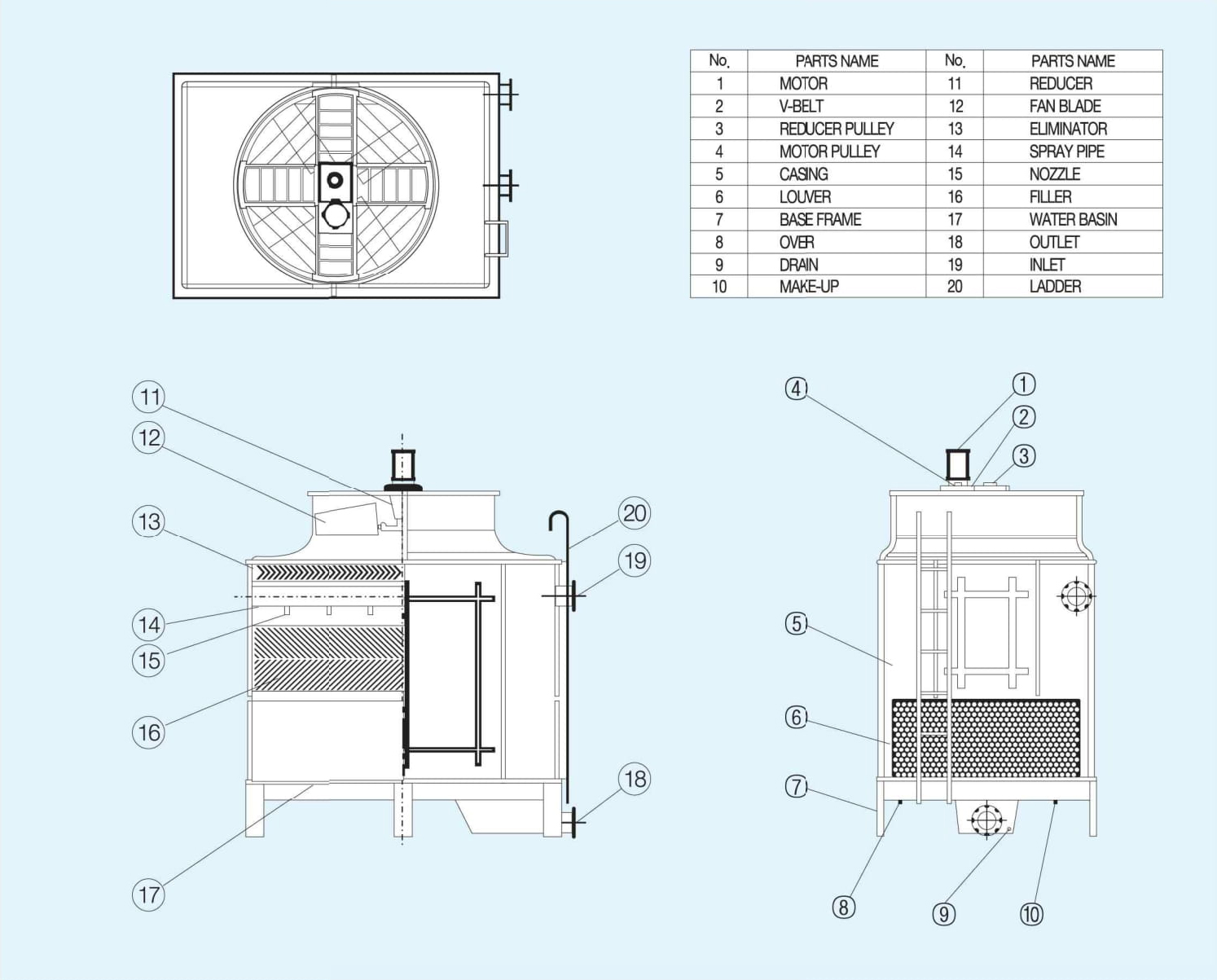 - Eliminator와 Louver 난연성 PVC재질로서 냉각수의 외부 비산을 최대한 억제 와 Louver 하였고, 정압 손실을 최소화하였습니다.